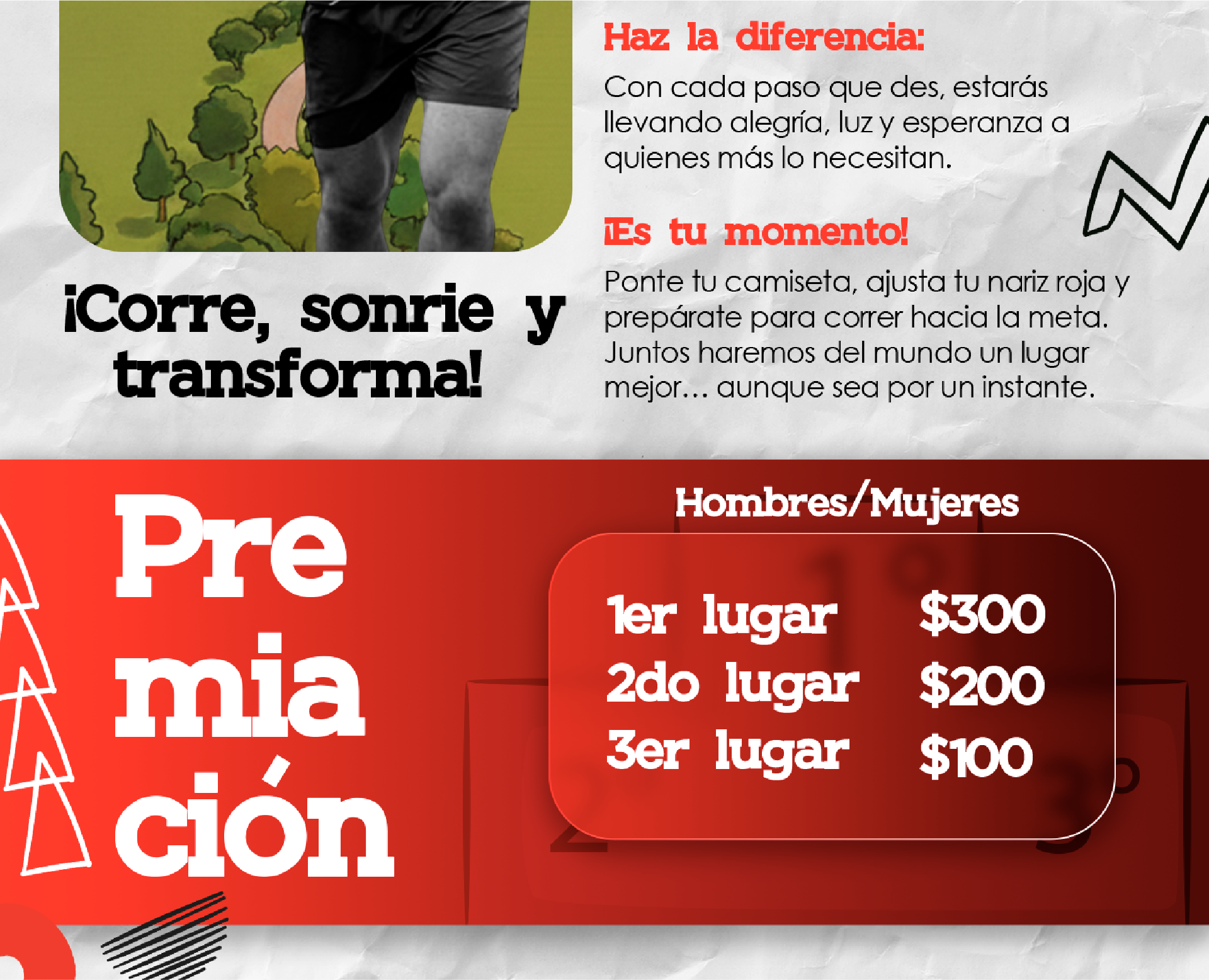 Ponte tu camiseta, ajusta tu nariz roja y prepárate para correr hacia la meta 🏁.